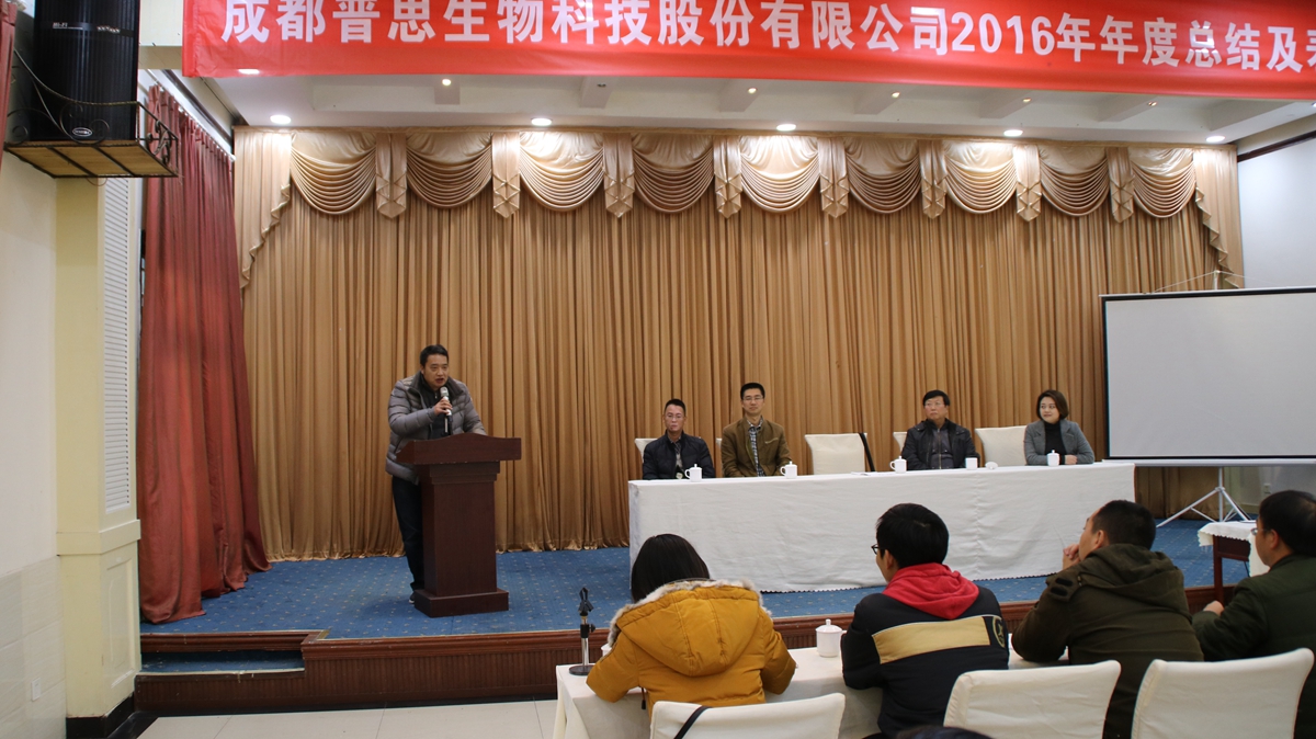 舊歲已展千重錦,新年再進(jìn)百尺竿!2016年是普思生物在“新三板”掛牌上市的第二年,這一年普思生物實現(xiàn)了快速的發(fā)展,收獲了較為滿意的成績,借著這股勢頭相信普思生物將會在丁酉雞年取得更輝煌的成就!2017年1月6日,公司在武侯區(qū)御翠草堂迎來了2016年年度工作總結(jié)暨表彰大會。會上公司領(lǐng)導(dǎo)和各部門負(fù)責(zé)人發(fā)表了熱情洋溢的講話,總結(jié)過去的2016年工作,并對2017年的工作作出部署和安排。會上還對2016年度優(yōu)秀員工、優(yōu)秀項目負(fù)責(zé)人、優(yōu)秀管理人員、優(yōu)秀團(tuán)隊、十年奉獻(xiàn)獎、季度“星級員工”以及年度優(yōu)秀軟文進(jìn)行了表彰,并頒發(fā)了獎勵。晚上公司全體員工一起共享豐盛的晚宴,全體員工度過了一個溫馨、愉快的夜晚。