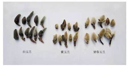 望春花、玉蘭是辛夷的主流品種,其花蕾均似毛筆頭,前者較小,密被茸毛,有光澤,氣芳香,味辛涼微苦;玉蘭花蕾稍大,密被茸毛,脫落處褐黑色;武當(dāng)玉蘭屬大型花蕾,卵圓形,被暗綠色茸毛,脫落處黑褐色,花被可達(dá)15片。