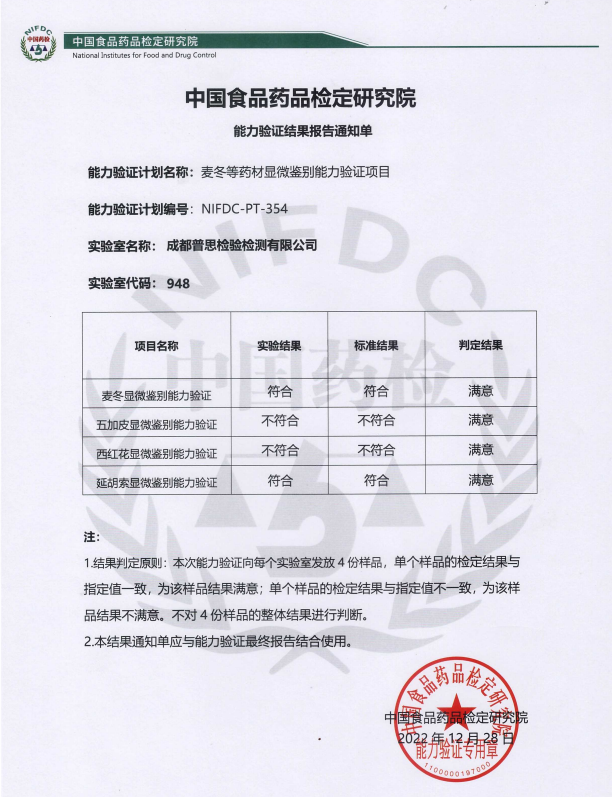 普思生物順利通過中檢院藥材顯微鑒別和含量測定兩項能力驗證