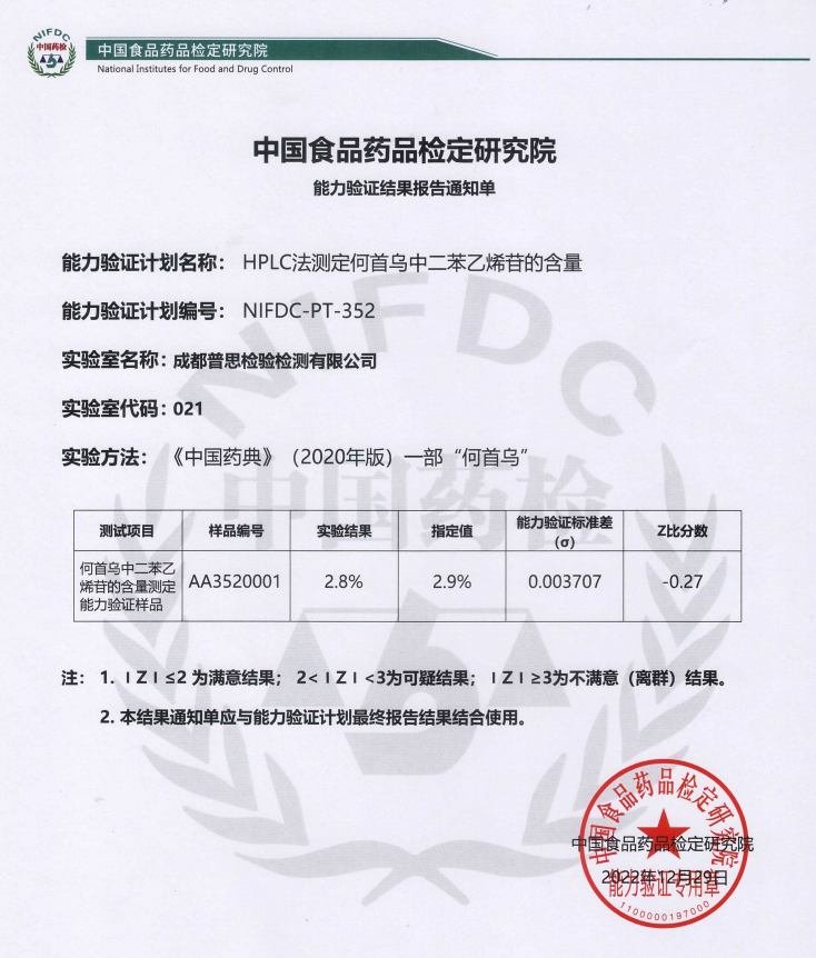 近日,成都普思生物科技股份有限公司旗下子公司“成都普思檢驗檢測有公司”通過了由中檢院于2022年組織的“麥冬等藥材顯微鑒別能力驗證項目”、“HPLC法測定何首烏中二苯乙烯苷的含量”兩項能力驗證,結(jié)果均為“滿意”。