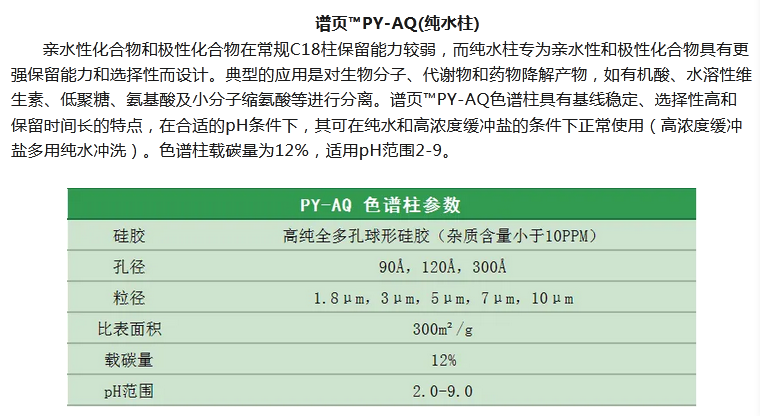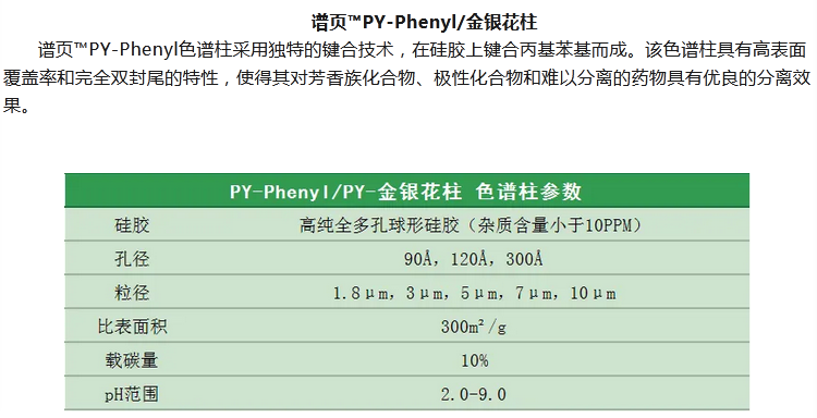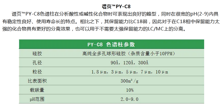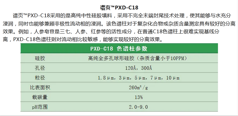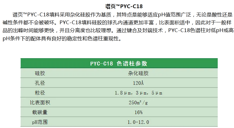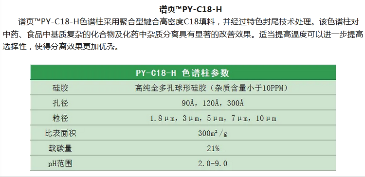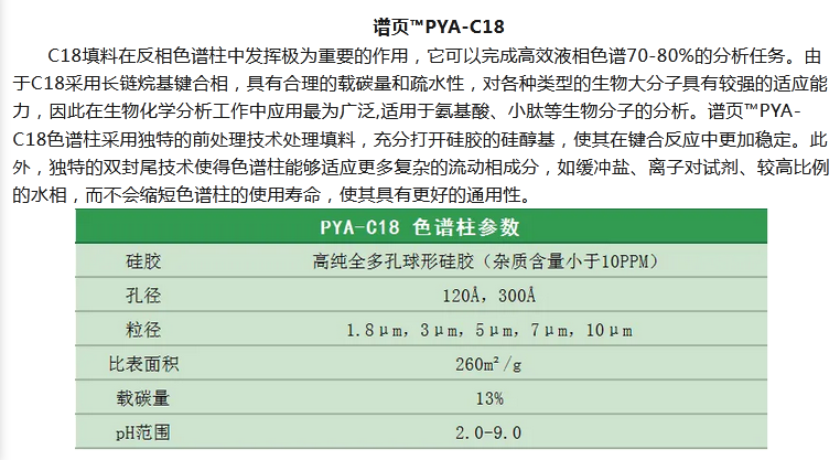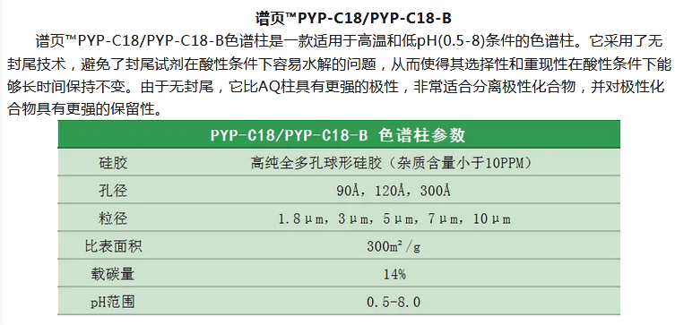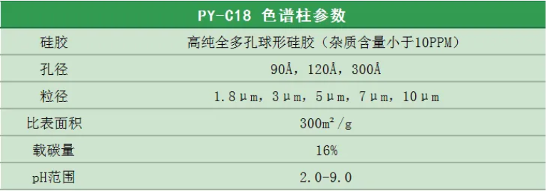 譜頁?PY-C18是本系列C18柱中最具普適性的色譜柱,具有優(yōu)異的穩(wěn)定性、獨(dú)特的官能團(tuán)鍵合及均勻的小分子封尾技術(shù)涂層,確保固定相具有高選擇性。加上獨(dú)有的裝柱工藝,使其擁有穩(wěn)定的基床,從而具有更高的柱效及批次間穩(wěn)定性。適合分離酸性、中性和堿性化合物以及小分子多肽等。