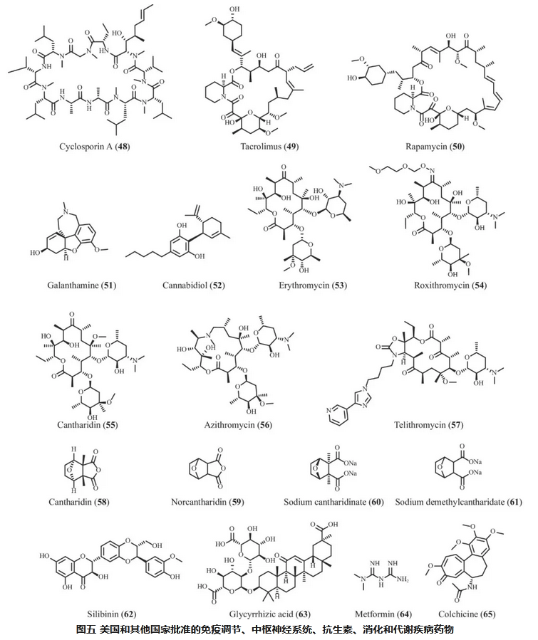 根據(jù)各種疾病的臨床治療需求,本綜述介紹了65種具有代表性的藥物,這些藥物或直接來(lái)源于天然產(chǎn)物,或來(lái)源于天然產(chǎn)物的衍生物。這些藥物已獲得國(guó)家醫(yī)藥產(chǎn)品管理局(NMDA)、美國(guó)食品藥品監(jiān)督管理局(FDA)、歐洲藥品管理局和日本藥品醫(yī)療器械管理局等監(jiān)管機(jī)構(gòu)的批準(zhǔn)。在這些藥物中,有29種是在中國(guó)開(kāi)發(fā)的,其余36種是在國(guó)際上獲得批準(zhǔn)的。