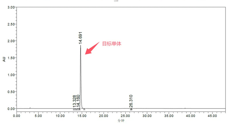 制備液相優(yōu)化:選用內徑150mm系統(tǒng),梯度洗脫結合動態(tài)軸向壓縮柱技術,單批次處理量達50g原料,獲得目標成分120g,純度99.2%(HPLC圖譜見下圖)原料及單體分離圖譜: