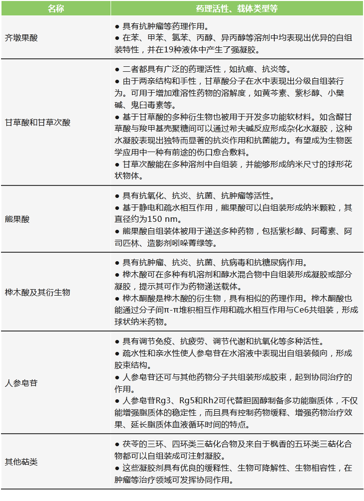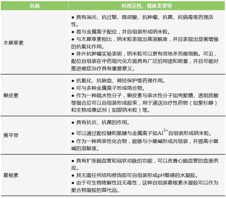 (1)一些中藥活性成分具備通過自組裝形成“自遞藥系統(tǒng)”的能力,可以充分利用其自身性質(zhì)形成遞送系統(tǒng),實現(xiàn)“藥輔合一”。