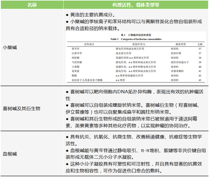 生物堿在許多中藥中廣泛存在,大多數(shù)有復(fù)雜的環(huán)狀結(jié)構(gòu),且含有N元素,呈現(xiàn)堿的性質(zhì)。生物堿是植物在應(yīng)對環(huán)境脅迫時產(chǎn)生的次生代謝產(chǎn)物,往往具有一定的毒性。在藥理方面,其表現(xiàn)為抗病毒、抗菌的活性。生物堿可以與多種中藥活性成分共組裝,以其自身作為藥物和載體作為藥物和載體,從而發(fā)揮更強的藥效。