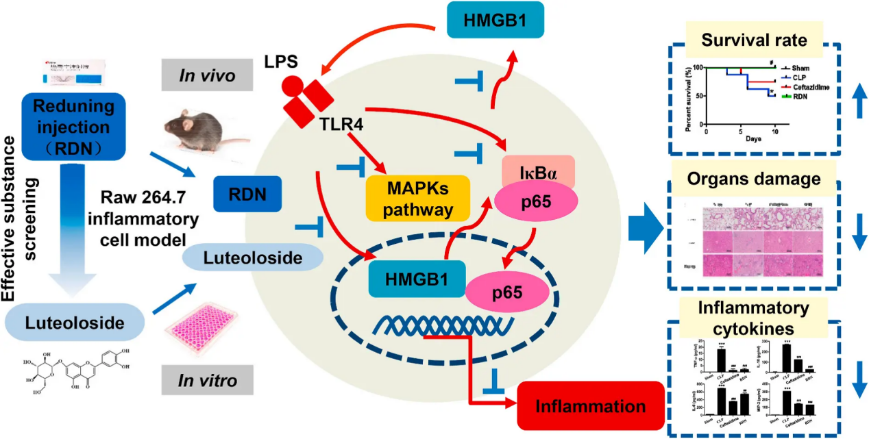 圖一 熱毒寧注射液(RDN)的核心效用成分木犀草苷的抗炎機制研究過程示意圖