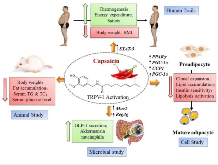 5. 抗肥胖作用:辣椒素已被證明可以抑制脂肪生成和促進(jìn)脂肪細(xì)胞中的脂質(zhì)氧化,通過作用于胃饑餓素調(diào)節(jié)下丘腦飽腹感和抑制食欲;通過上調(diào)UCP2和UCP3抑制體重增加;通過調(diào)節(jié)腸道菌群來增強(qiáng)產(chǎn)熱和維持代謝穩(wěn)態(tài)(圖二)。