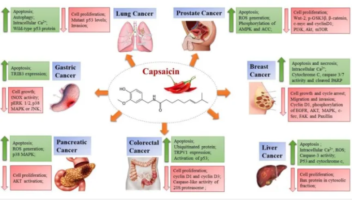 4.抗癌作用:多項(xiàng)研究表明,辣椒素可以調(diào)節(jié)參與癌細(xì)胞增殖、細(xì)胞周期阻滯、信號(hào)轉(zhuǎn)導(dǎo)、凋亡和轉(zhuǎn)移的基因和酶的表達(dá)水平,具有顯著的抗腫瘤活性,對(duì)胃癌、乳腺癌、肺癌、前列腺癌、結(jié)直腸癌、胰腺癌等多種類型的人類癌癥均有較強(qiáng)的抗癌作用(圖一)。