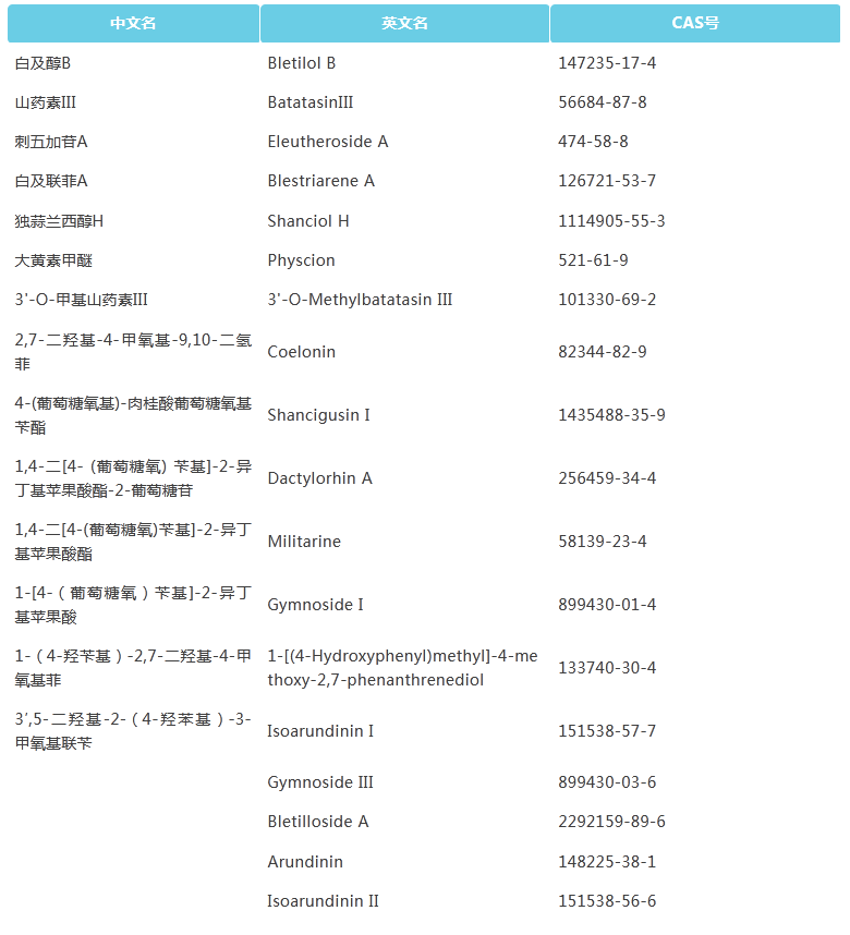目前我司共有多種白及中聯(lián)芐類、二氫菲類、菲類、聯(lián)菲類等活性成分,針對(duì)以下重點(diǎn)推薦的產(chǎn)品,普思生物均現(xiàn)貨供應(yīng),當(dāng)天發(fā)貨(價(jià)格面議)。