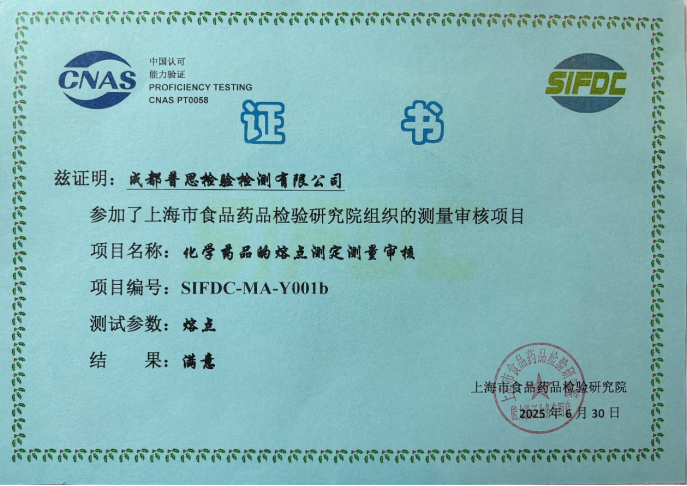 近日,成都普思生物科技股份有限公司旗下子公司“成都普思檢驗(yàn)檢測有限公司”通過了由上海市食品藥品檢驗(yàn)研究院于2025年組織的測量審核項(xiàng)目“化學(xué)藥品的熔點(diǎn)測定”,結(jié)果為“滿意”。
