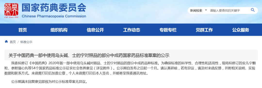 重磅更新丨國家藥典委員會擬修訂《中國藥典》2020年版一部中使用烏頭堿對照品、士的寧對照品的54個中成藥品種標(biāo)準(zhǔn)